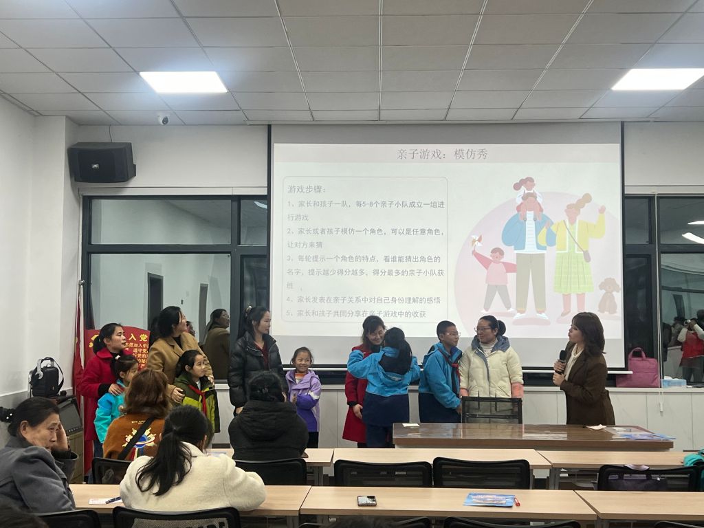 老师围绕“温暖的亲子关系”这一课题,深入浅出的向家长们阐述了该如何和孩子双向互动营造健康的亲子关系。接着, 通过“情绪模拟考验”、“模仿秀”、“乌鸦游戏”和“传声游戏”等亲子小游戏,增强家长与孩子之间的互动,加深彼此的了解。