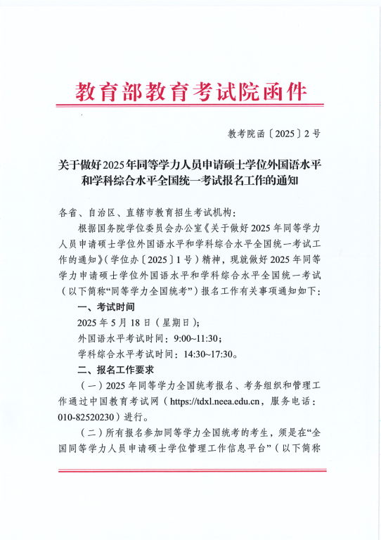 关于做好2025年同等学力人员申请硕士学位外国语水平和学科综合水平全国统一考试报名工作的通知